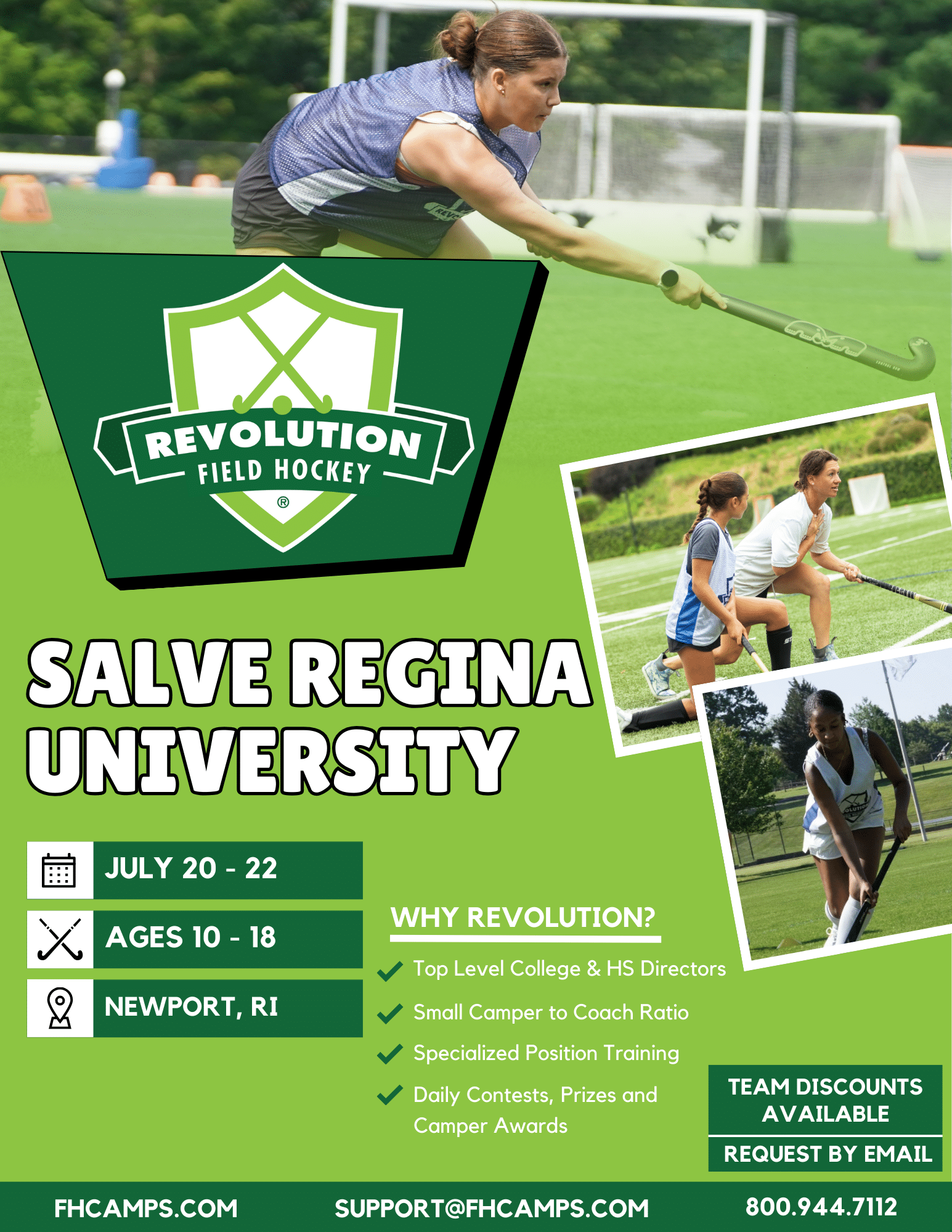 Salve Regina University is beautifully located in the heart of Newport, RI, overlooking Sheep Point Cove and Easton Bay. Salve’s state-of-the-art facilities provide the perfect summer environment for campers to develop their skills. This summer, join us for a fun camp experience that focuses on improving your field hockey skills, under the leadership of Head Coach from Salve Regina Jen Foster. This is a sell-out camp year after year, and does not disappoint!